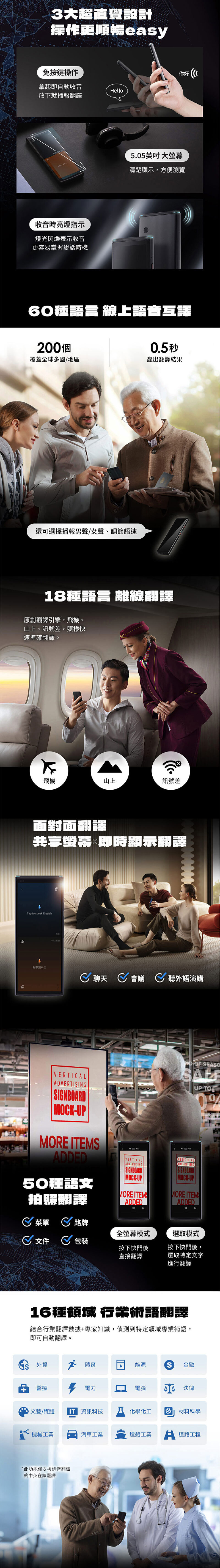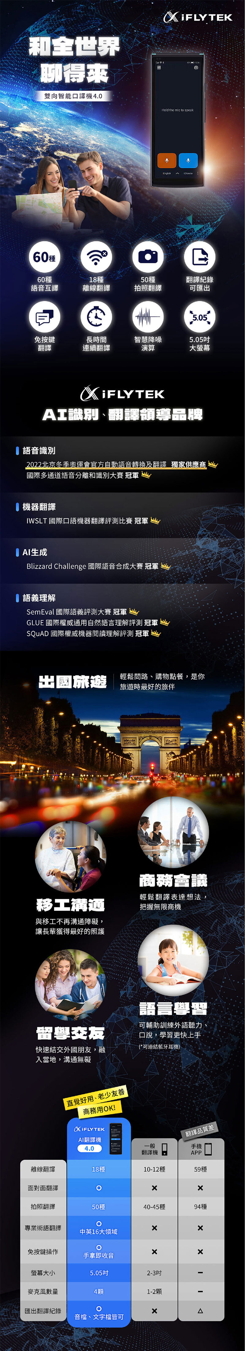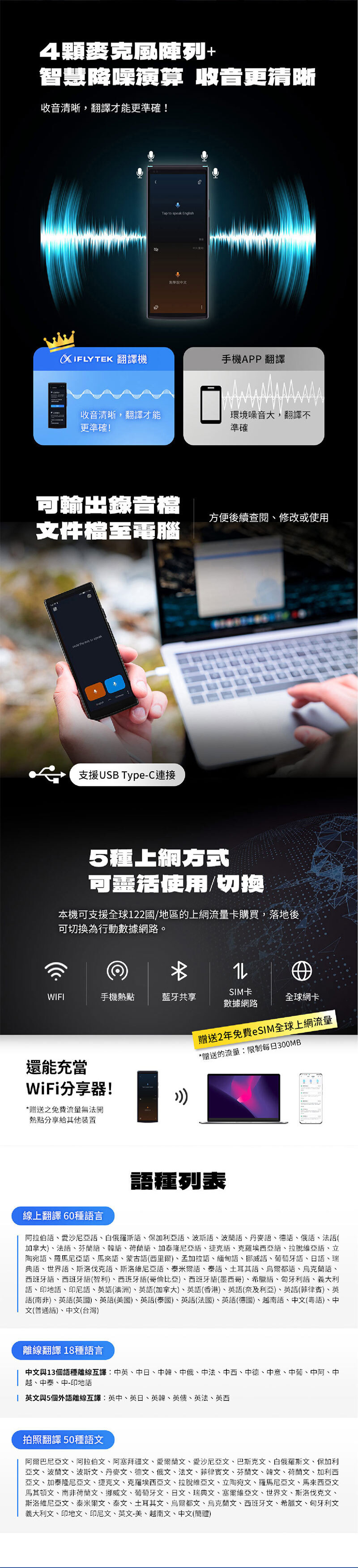 4麥克風+降噪演算,收音清晰翻譯才準確 免按鍵操作,拿起即收音/放下就翻譯 60種語言線上語音互譯