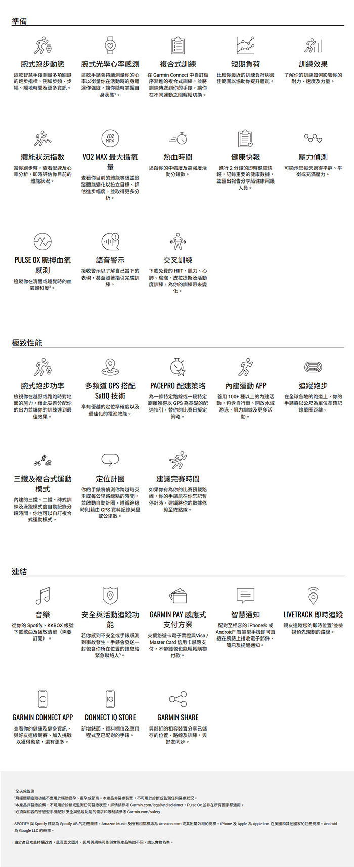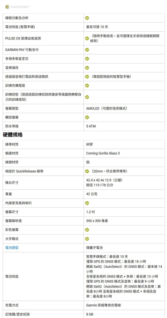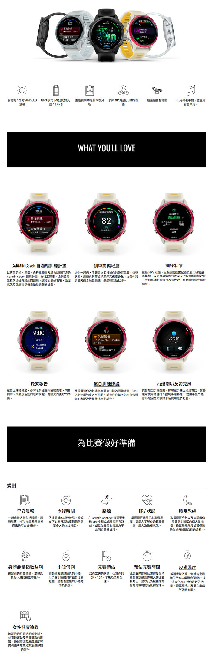 旗下最明亮的1.2吋AMOLED 螢幕,採用輕量鋁合金錶圈,觸控、實體按鈕雙操作模式 內建麥克風及喇叭,可在相容智慧型手機上,直接在腕上撥接電話 搭載定位計圈、配速策略、Garmin Coach個人化跑步及三鐵訓練計畫等,提升您的跑步體驗!