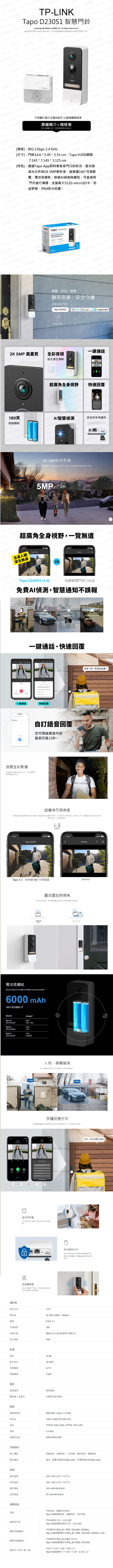 TP-LINK Tapo D230S1 Wi-Fi AI智慧門鈴 一鍵通話 全彩夜視 即時觀看 AI智慧偵測 防水防塵