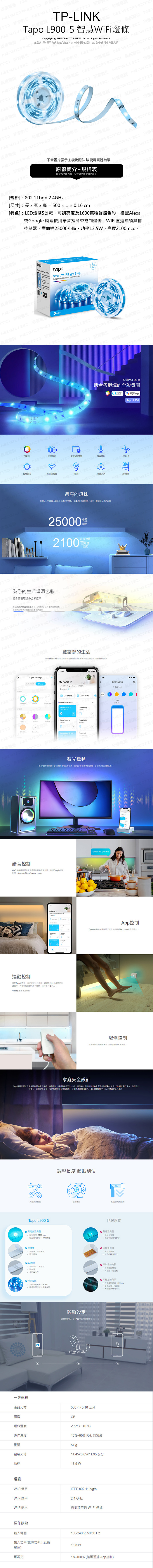 TP-LINK Tapo L900 1600萬+ RGB 多彩調節 LED燈帶 Wi-Fi 智慧照明 全彩智能燈條-5米