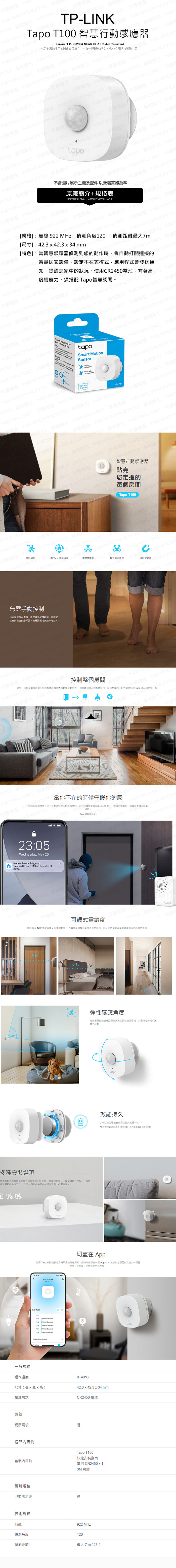 TP-LINK Tapo T100 智慧行動感應器(CR鈕扣電池)(偵測動作/節能/磁吸式.黏貼/Tapo APP)