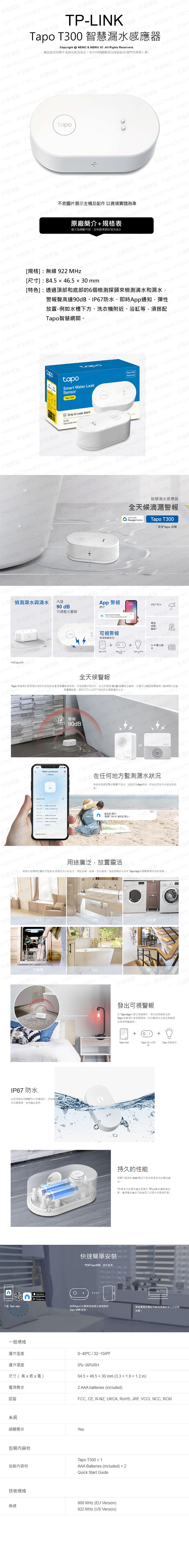 TP-LINK Tapo T300 IP67 智慧滴漏水感應器 智能警報器 傳感器(90dB可調式警報/智慧連動/Tapo APP)