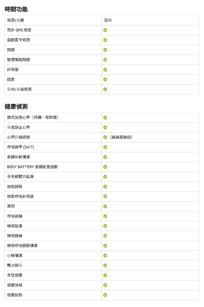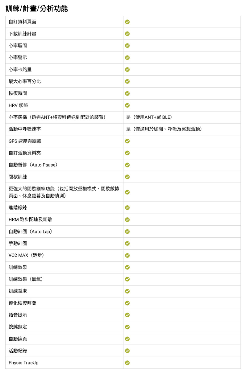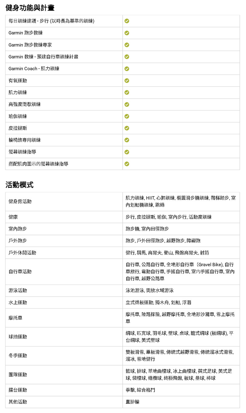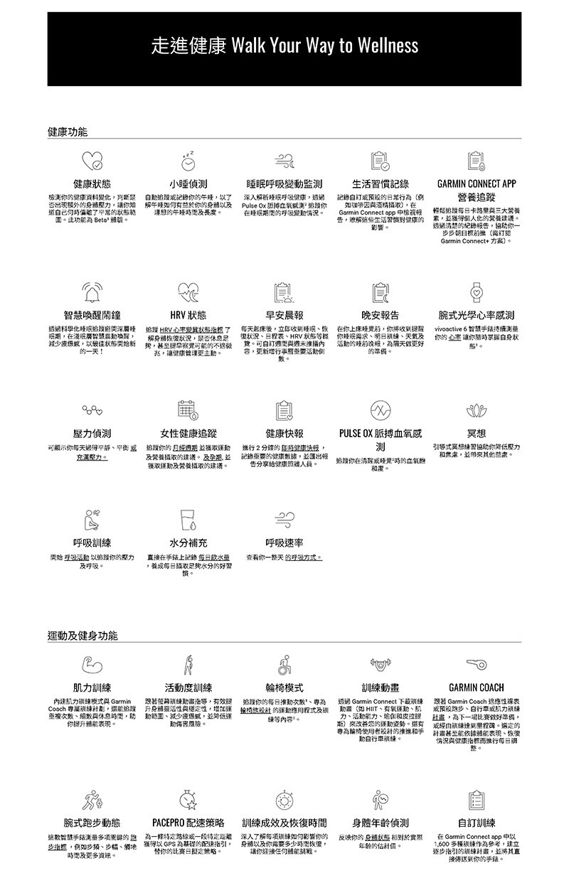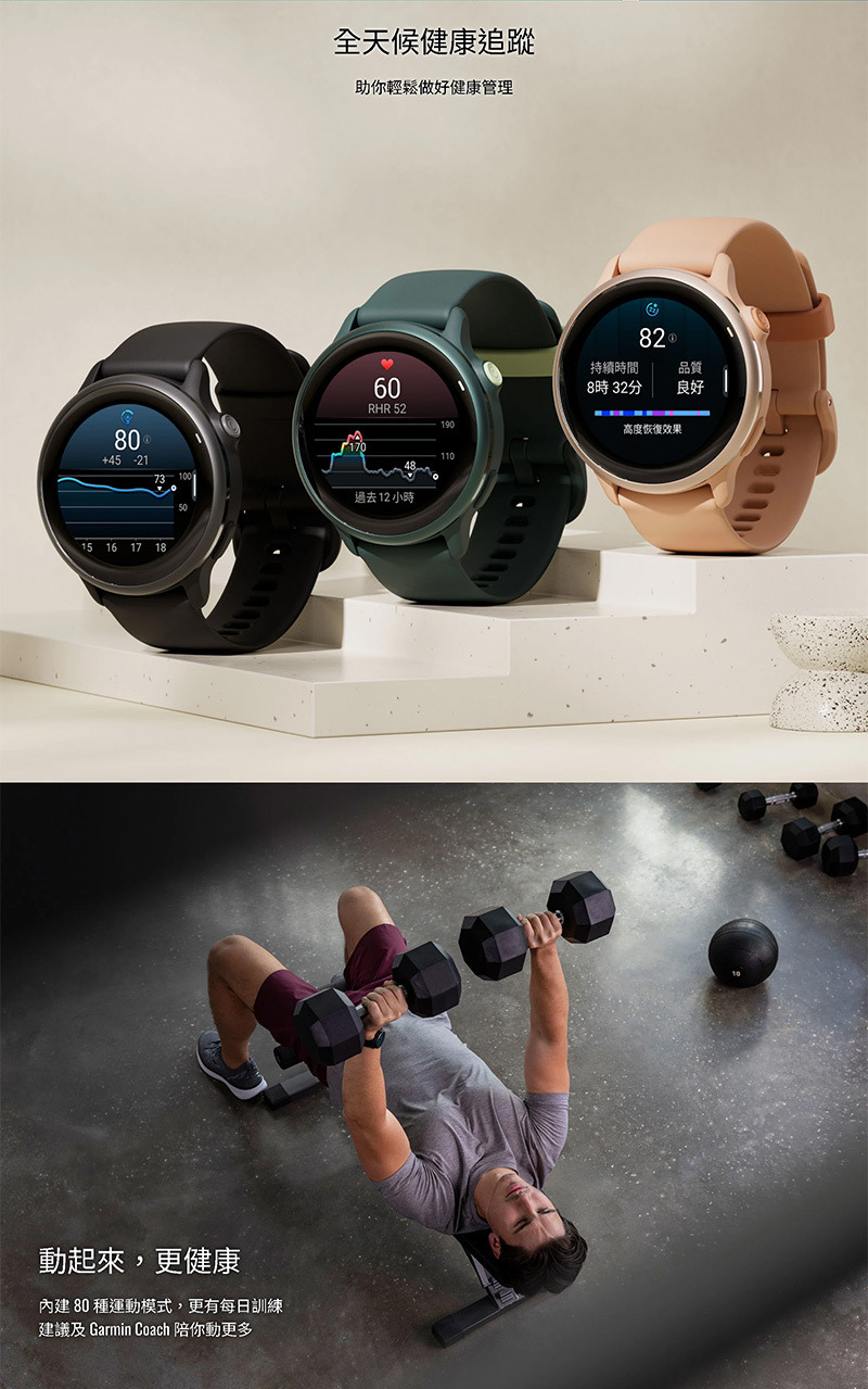 螢幕亮度升級,健康數據更直覺易讀,提供個人化每日訓練建議 全新跑步動態分析,內建80+種運動模式,從跑步到高強度間歇,應有盡有 支援Garmin Pay行動支付,出門不用再帶錢包