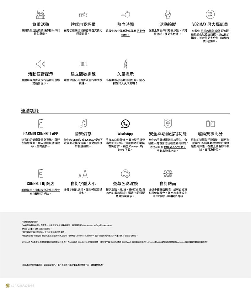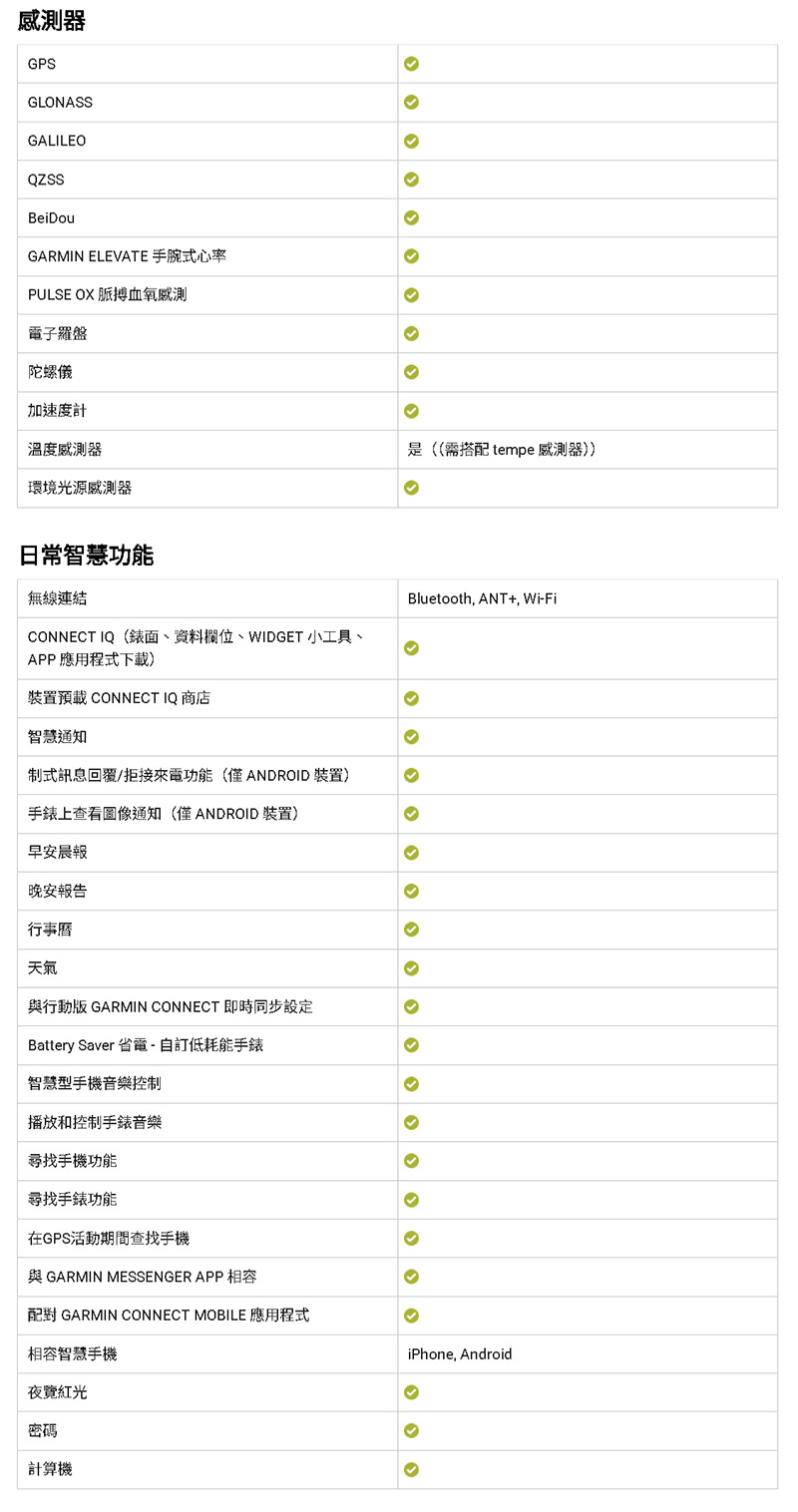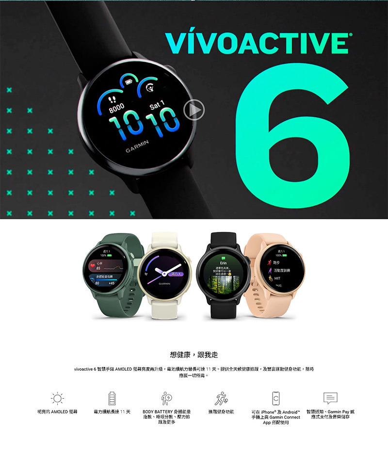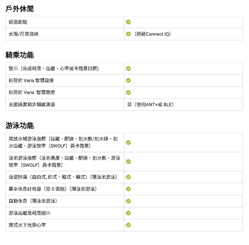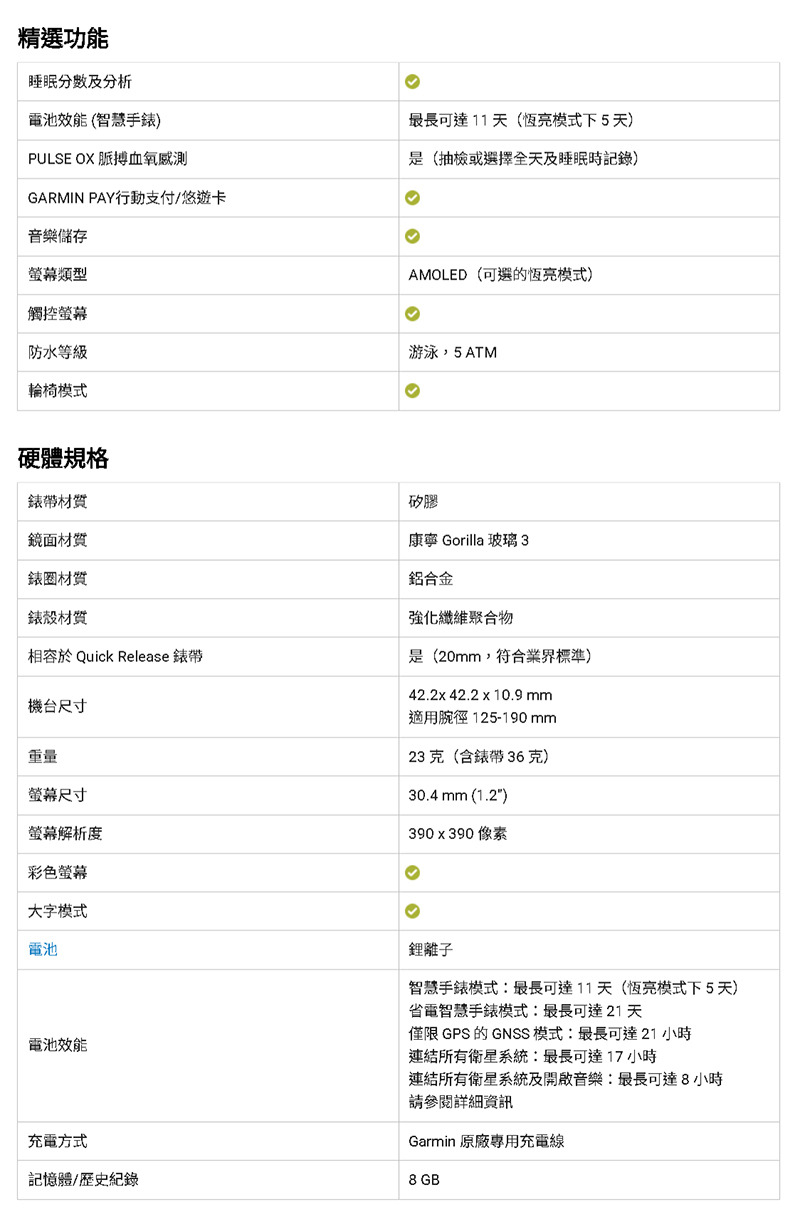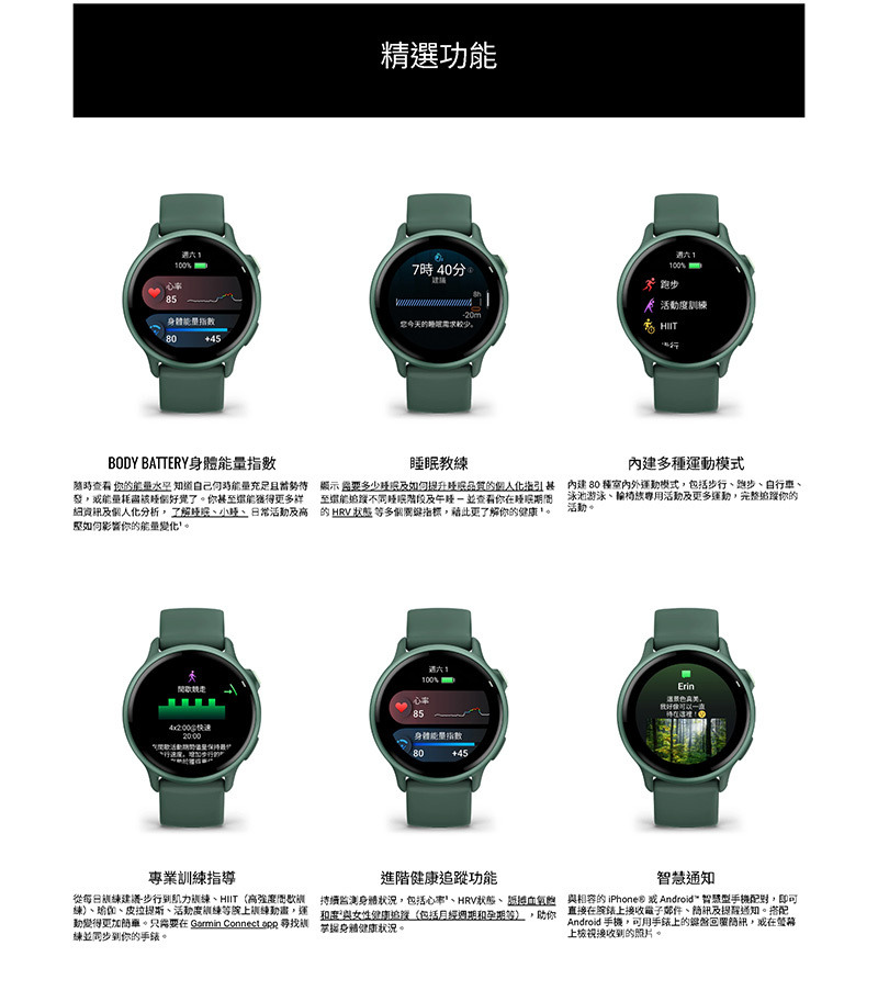 螢幕亮度升級,健康數據更直覺易讀,提供個人化每日訓練建議 全新跑步動態分析,內建80+種運動模式,從跑步到高強度間歇,應有盡有 支援Garmin Pay行動支付,出門不用再帶錢包