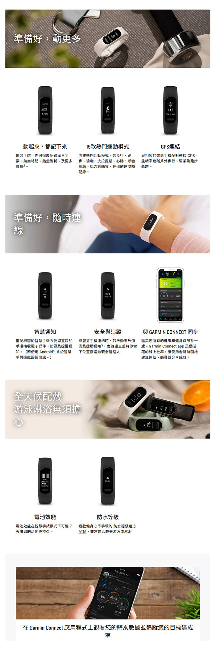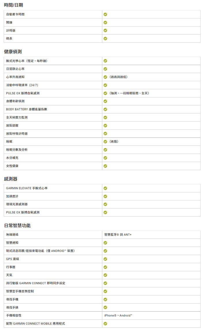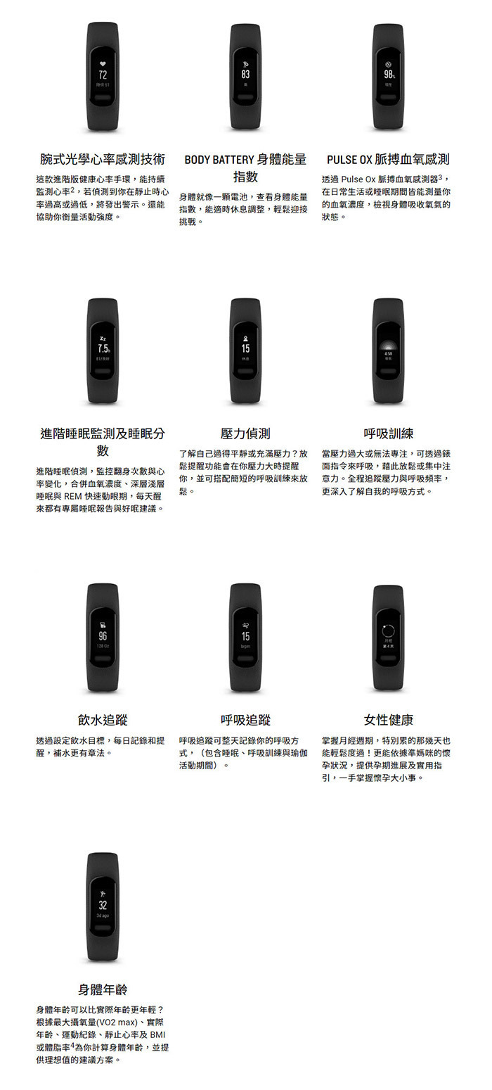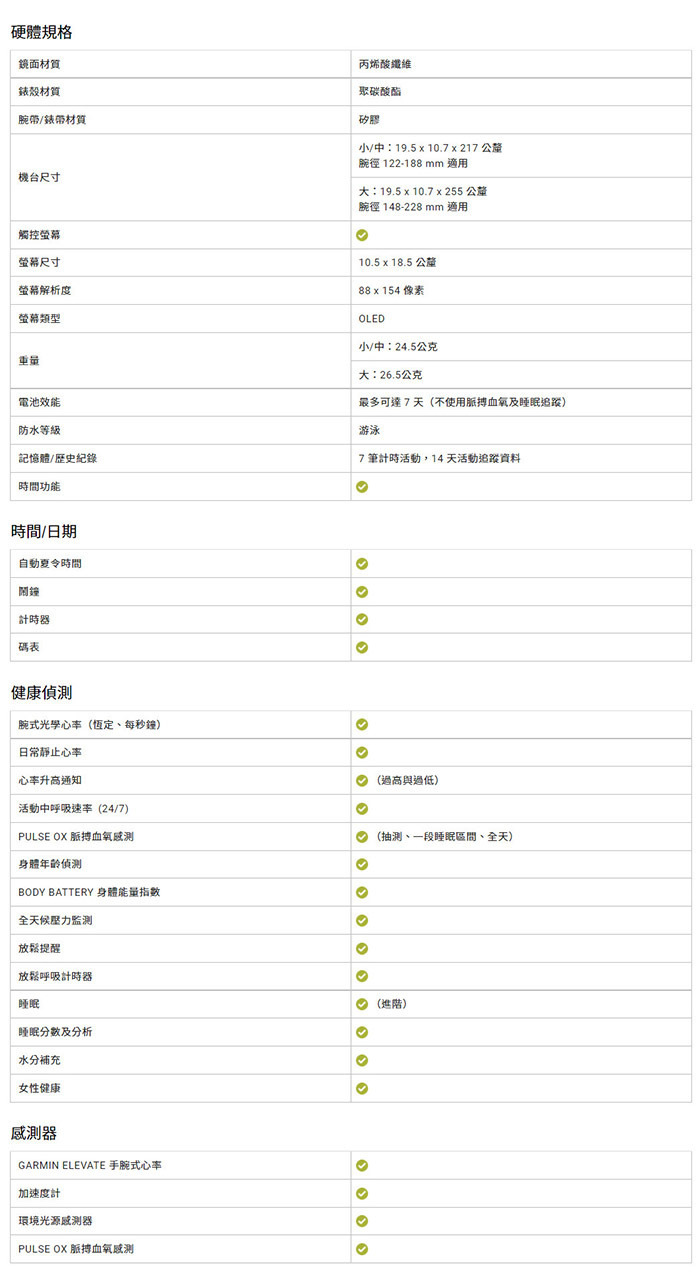 好用又舒適,搭載了觸控及按鍵介面,以及更亮、更大的螢幕,讓文字更容易閱讀 監測你的呼吸、PulseOx脈搏血氧、Body Battery身體能量指數、女性健康指標 與相容的智慧型手機配對即可享有來電智慧通知、簡訊、行事曆等功能,保持連結不中斷